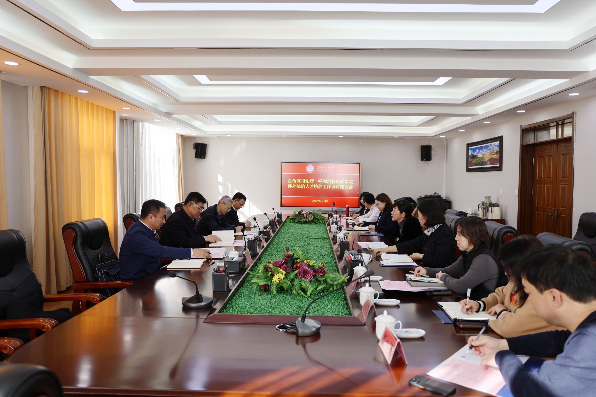 为进一步做好法治人才培养工作,加强法治建设,3月12日,自治区党委依法治区办副主任、司法厅党委书记、厅长白永平,自治区司法厅党委委员、副厅长张生,司法厅相关处室负责人一行来365上市公司官网开展专题调研。会前,校党委书记刘九万会见了白永平一行。党委副书记、校长王敏,党委副书记格根哈斯与白永平一行座谈交流。
