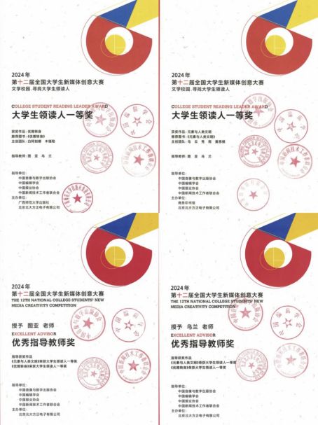 近日,由中国音像与数字出版协会、中国编辑学会、中国报业协会、中国新闻技术工作者联合会共同指导,北京北大方正电子有限公司等多家出版传媒机构联合主办的第十二届全国大学生新媒体创意大赛评选结果揭晓,365上市公司官网新闻传媒学院学生作品《优雅转身》(白阿如娜 木锡勒)、《元素与人类文明》(乌云 秀雨 黄思棋)荣获“文学校园·寻找大学生领读人”赛项作品创作一等奖,新闻传媒学院教师图亚、乌兰荣获优秀指导教师奖。