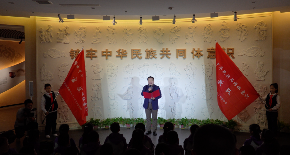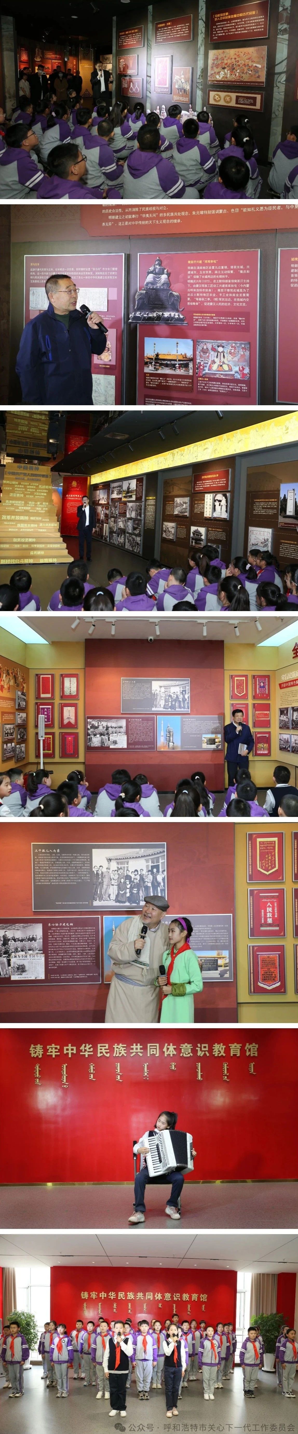 揭牌仪式后,进行了“铸牢”馆里启“铸牢”宣教活动。活动聚焦馆教一体、馆创一体、馆演一体,邀请“五老”讲解团,即“老马说马”博主马智聪,讲述马镫的起源、演变及历史作用;邀请历史文化学者、老旧城人曹建成,讲述从战国云中古城到呼和浩特,城市几次更名和背后不同历史时期的交往交流交融史实;邀请大型交响诗画《我愿以身许国》老创作人讲述中国精神谱系中的“两弹一星”精神;邀请土生土长的额济纳人、老教授殷俊海,讲述内蒙古额济纳旗人民为支持航天事业“三易旗府”的故事;邀请内蒙古民族艺术剧院演员芒来和绿地小学学生吴非凡共同演绎《额济纳河的诉说》主题短剧,通过爷孙对话展现额济纳旗人民“最好牧场让航天”,舍小家为大家的爱国情操。活动中,春蕾第一小学学生孙婉然还表演了手风琴独奏《红星歌》,五一班全体同学共同朗诵了《少年中国说》,表达了同心共筑中国梦的决心。