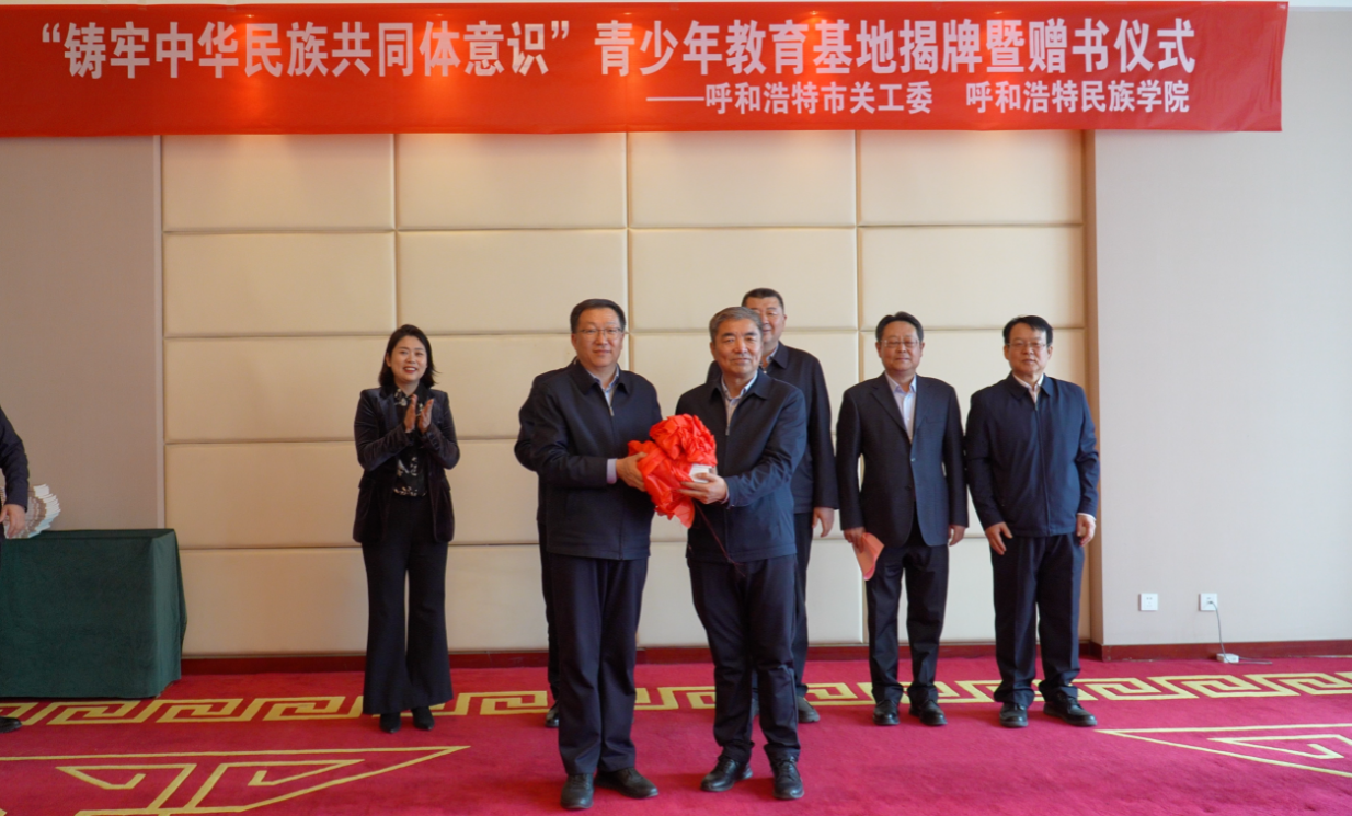 刚布和、格根哈斯共同为“铸牢中华民族共同体意识”青少年教育基地揭牌,格日乐图代表关工委向学校赠送了《关爱成长 书香守望》书籍,刘瑞鸿接受了赠书。