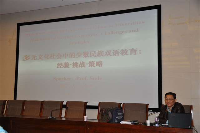 苏德教授还结合了自己的研究成果,就如何更好地开展双语教学提出了自己的独特见解。双语教学与民族文化的传承、学术研究成果的转化、双语教学面临的问题与困难作了一一的讲解。随后苏德教授重点讲述了给教育部和国家民委递交的关于“双语教育”的报告,展示了具体的调研过程、质性数据分析、教研结果,并从国家民族团结和稳定的高度指出了民族地区开展“双语教育”的路径。